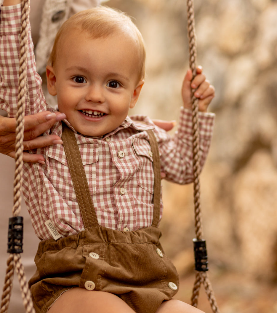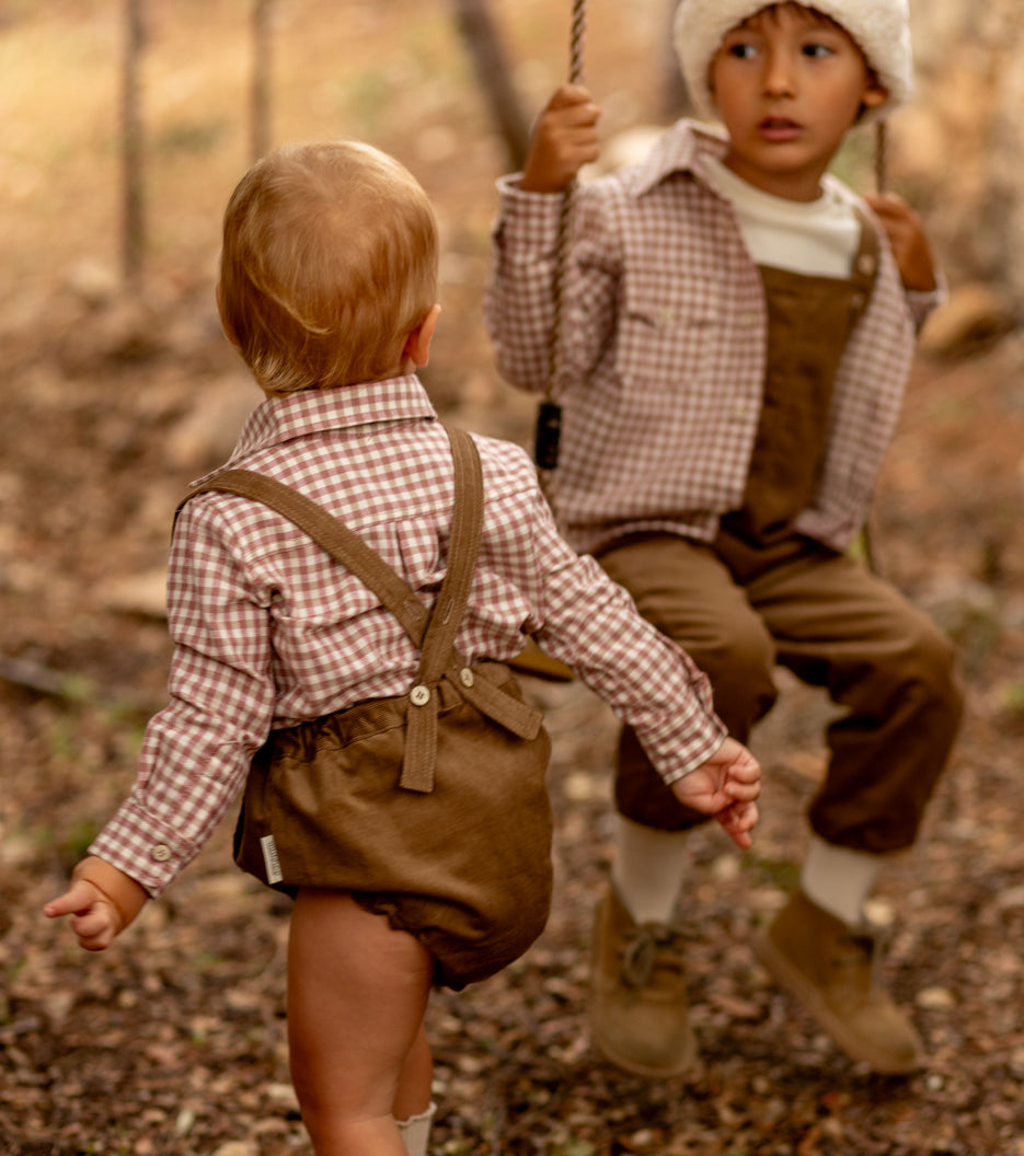 Bombacho con tirantes en pana fina de algodón orgánico 100% en color marrón chocolate con leche. Es un modelo muy versátil y fácil de combinar, pensado tanto para niño como para niña.