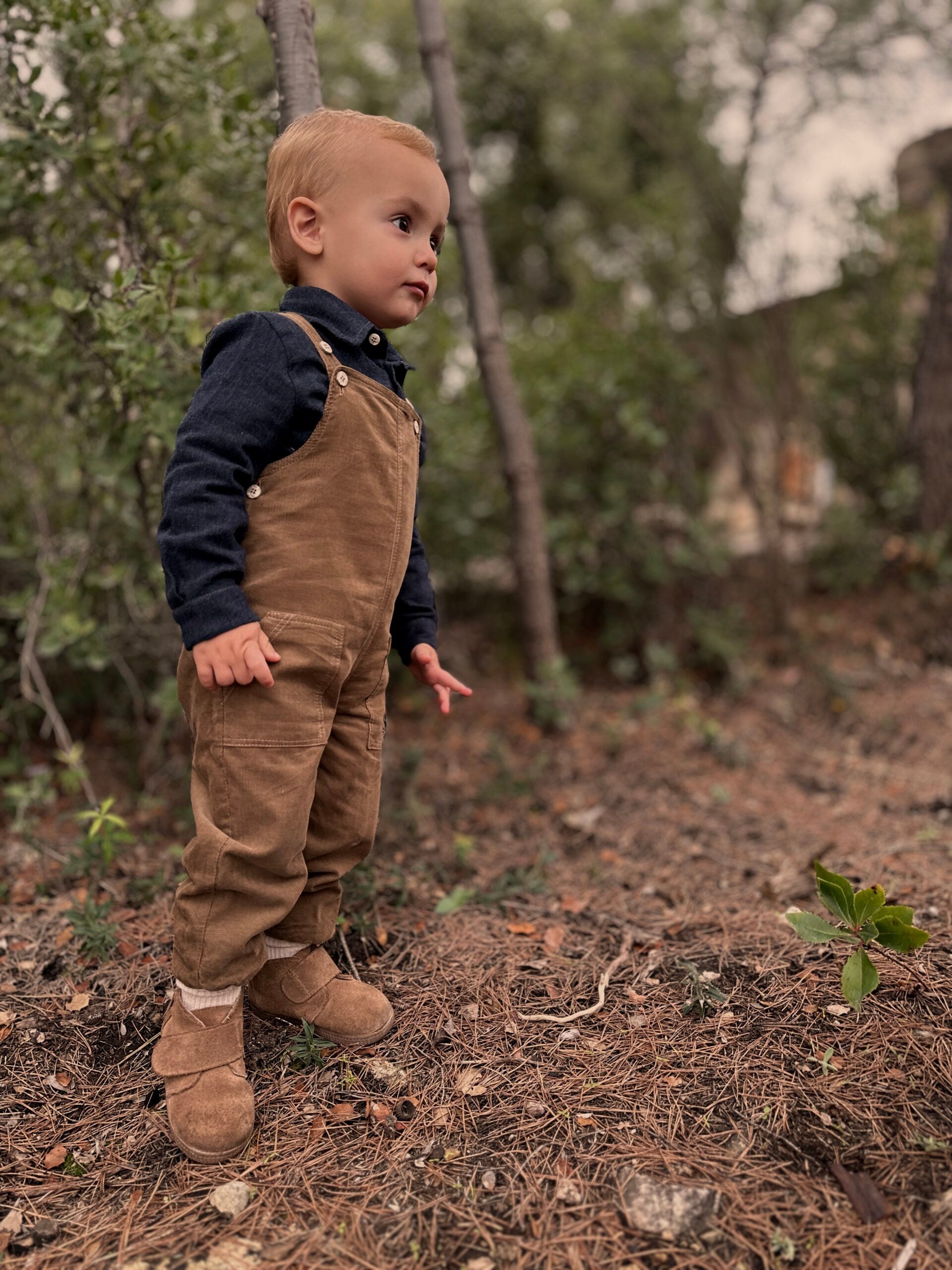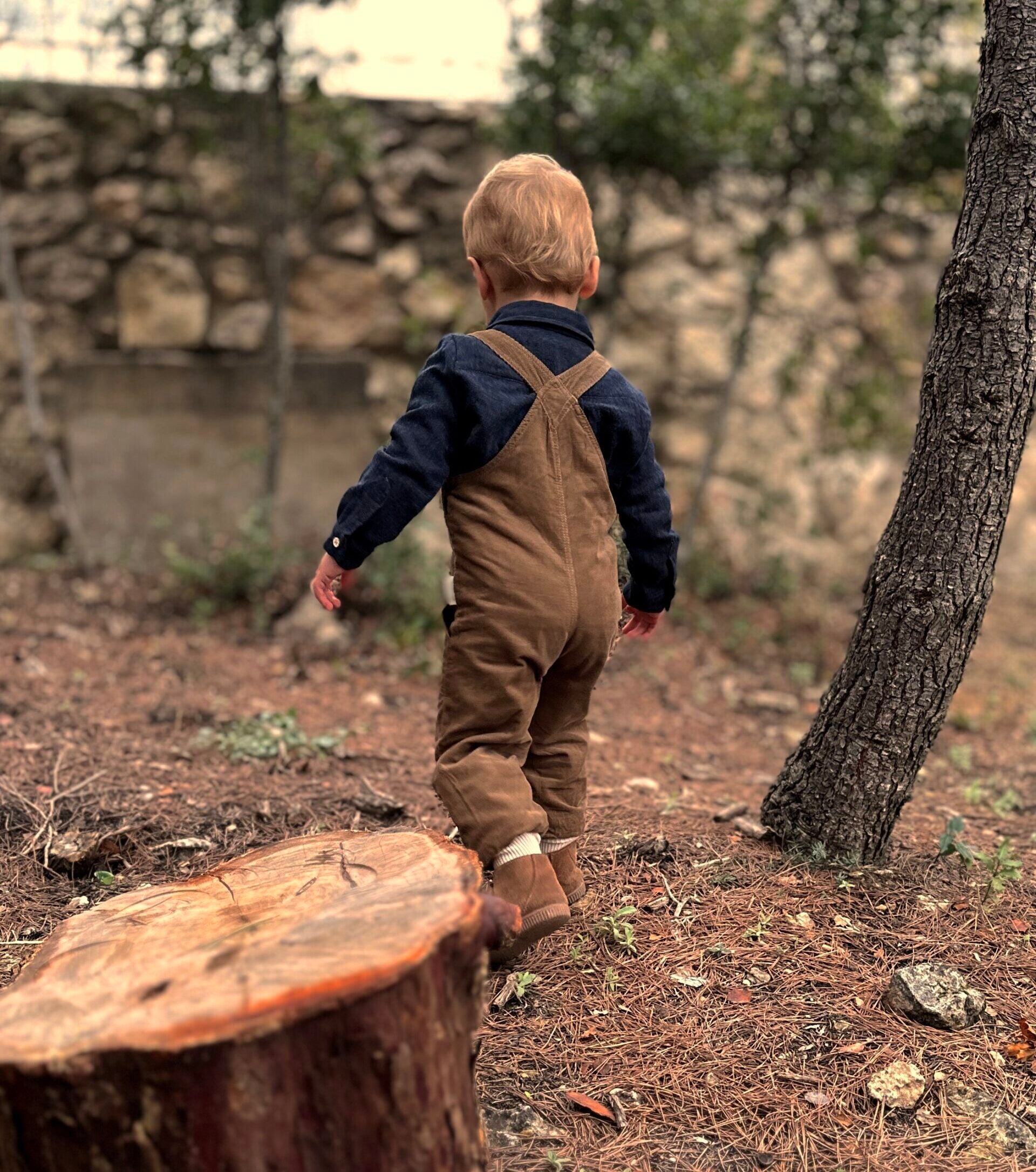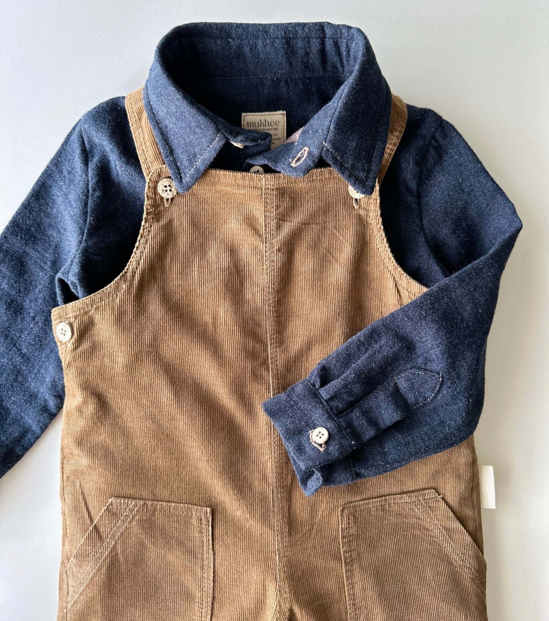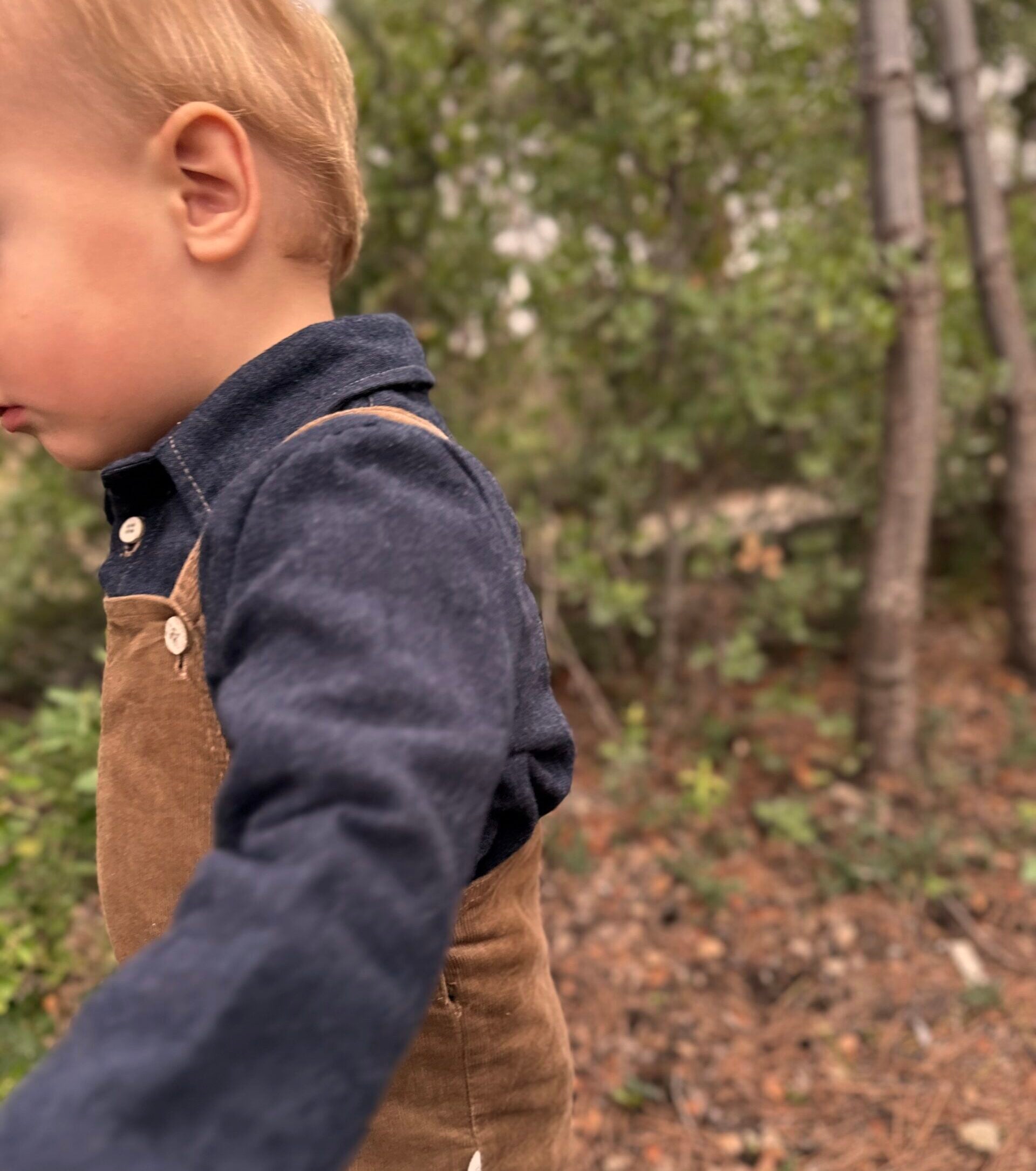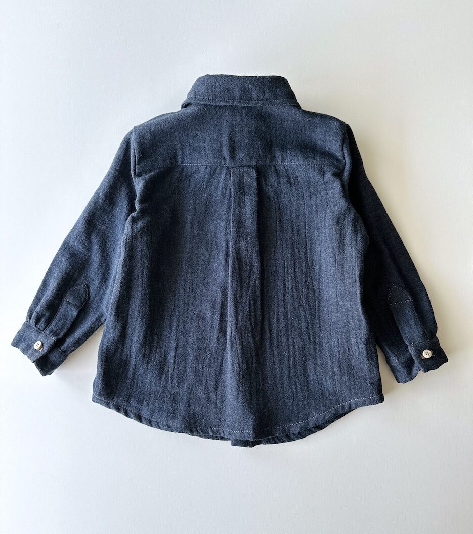 Camisa en muselina de algodón orgánico 100% en azul marino e interior en marrón empolvado. Un color muy favorecedor y muy combinable tanto en niña como en niño.