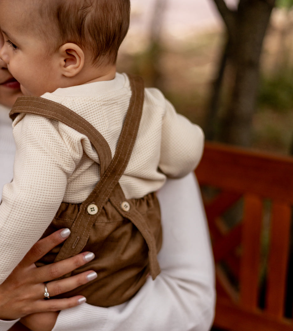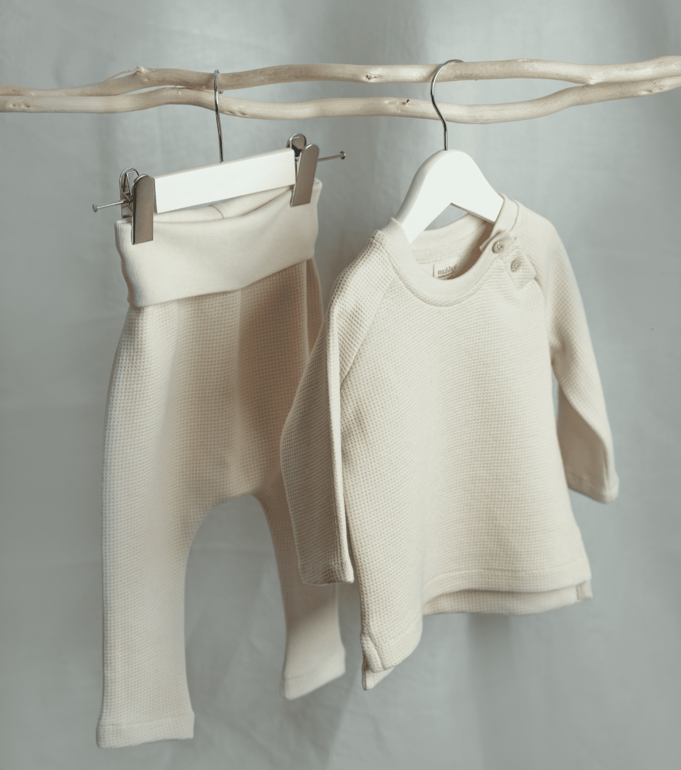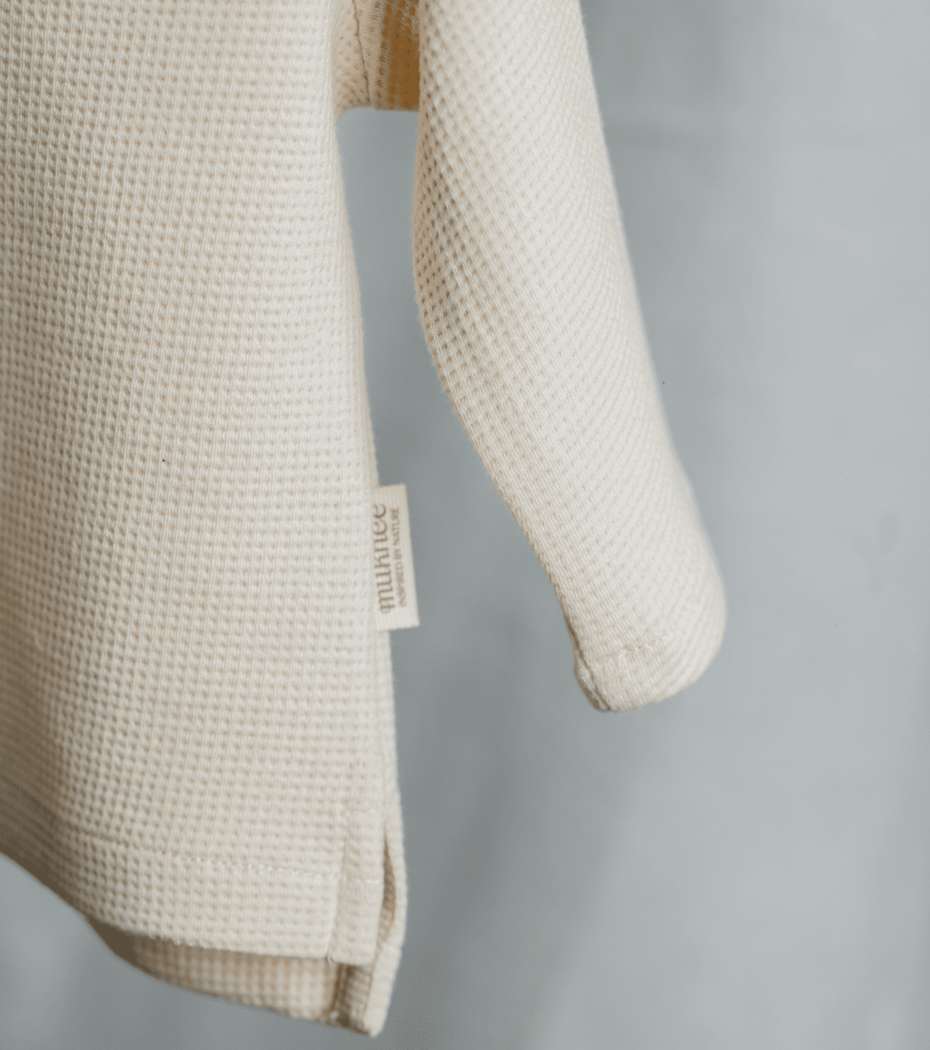 Camiseta nido de abeja para bebé confeccionada 100% en punto de algodón orgánico certificado GOTS. El tejido es natural, no está blanqueado, y como resultado a menudo podrás ver algunas semillas de la planta de algodón en la tela. Es una prenda muy calentita, súper suave y muy agradable al contacto con la piel del niño.