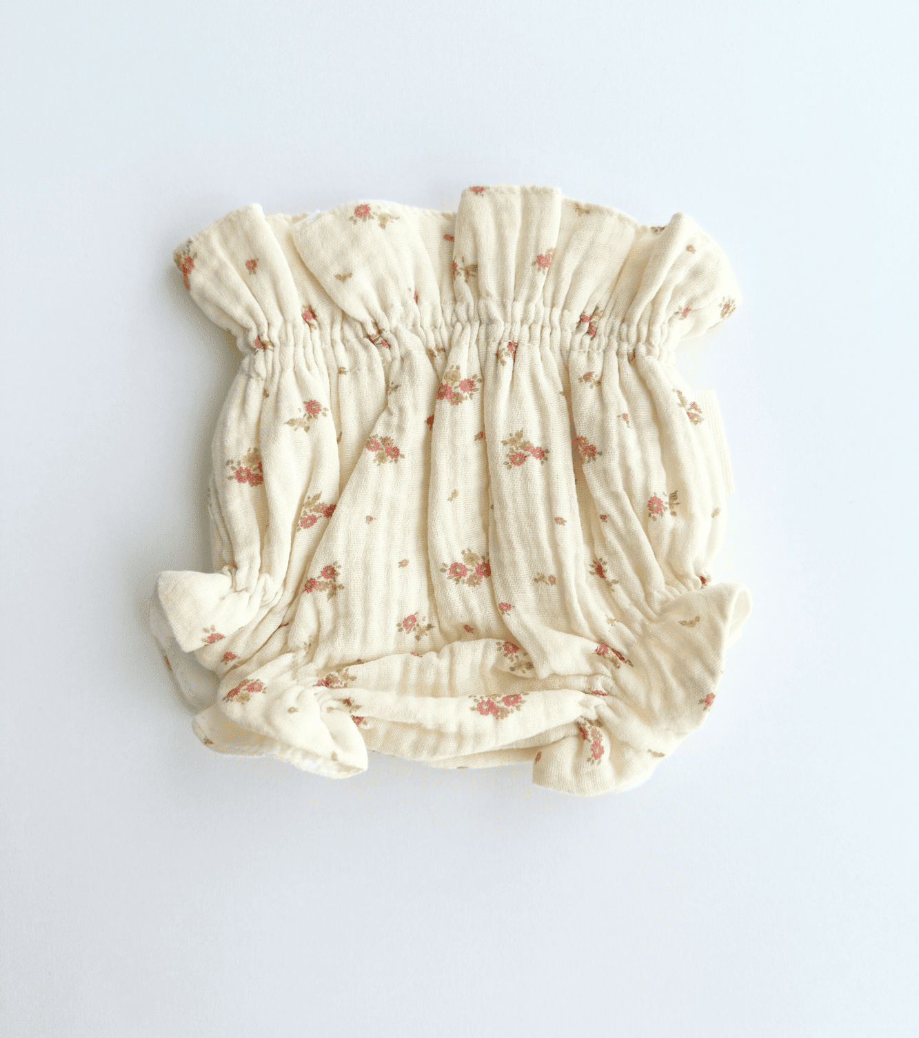Conjunto de blusa y culetín en muselina doble de algodón orgánico 100% con estampado de flores en color rosa palo sobre fondo crudo. Un estampado muy dulce.