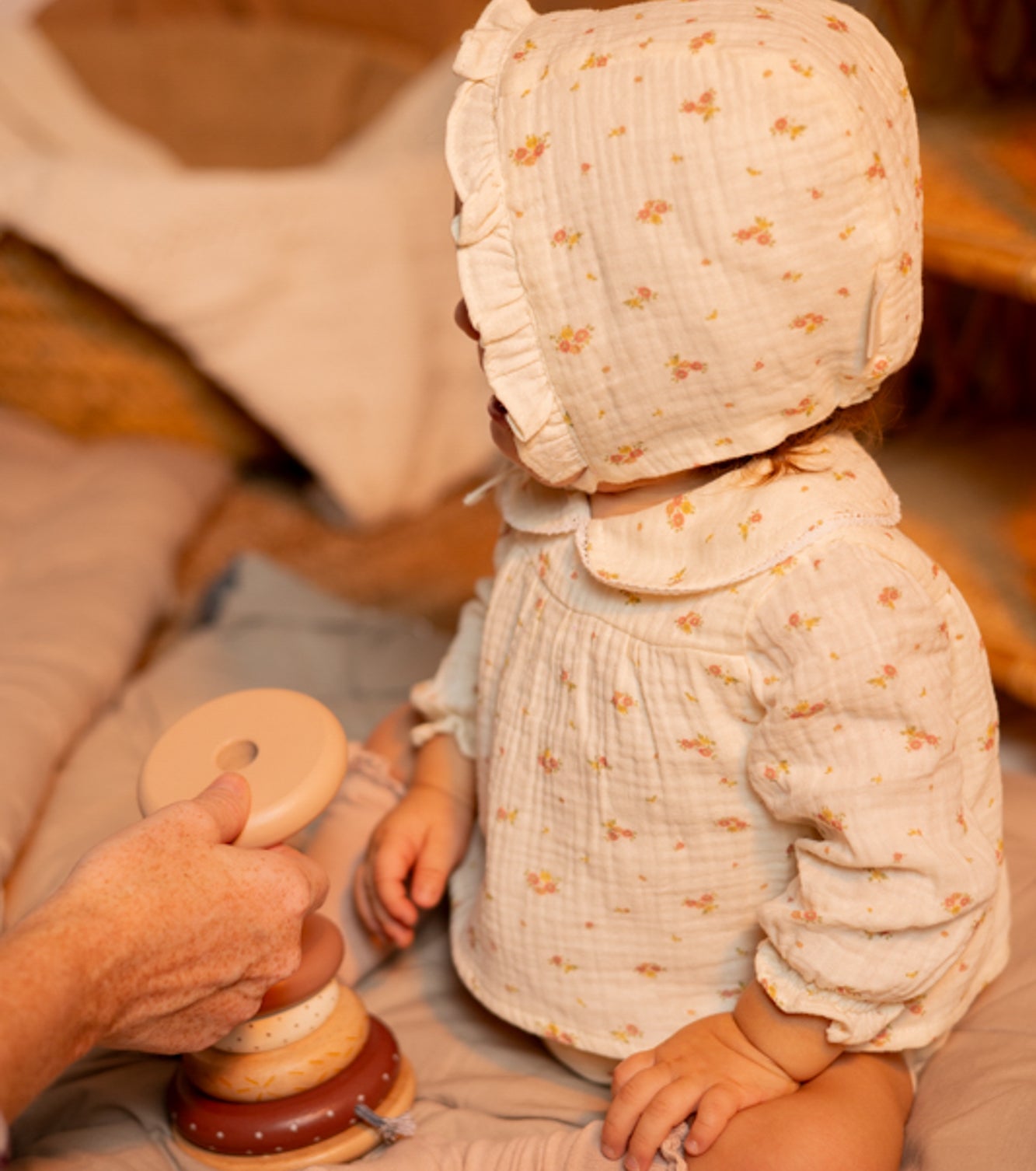 Conjunto de blusa y culetín en muselina doble de algodón orgánico 100% con estampado de flores en color rosa palo sobre fondo crudo. Un estampado muy dulce perfecto desde recién nacido.