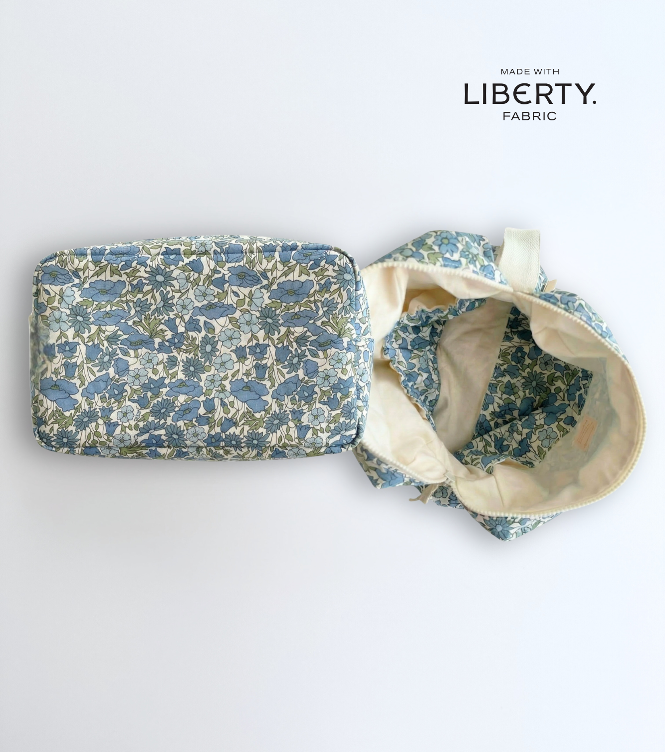 Neceser de algodón 100% en estampado Liberty de la colección Nomeolvides en flores azules con detalles en verde, forrado en el interior, con bolsillos interiores a ambos lados. Cierre con cremallera y asa lateral. Es un neceser muy ligero y con gran capacidad.
