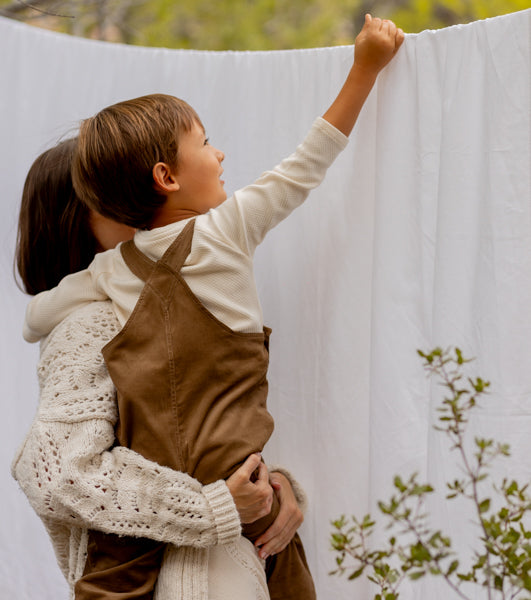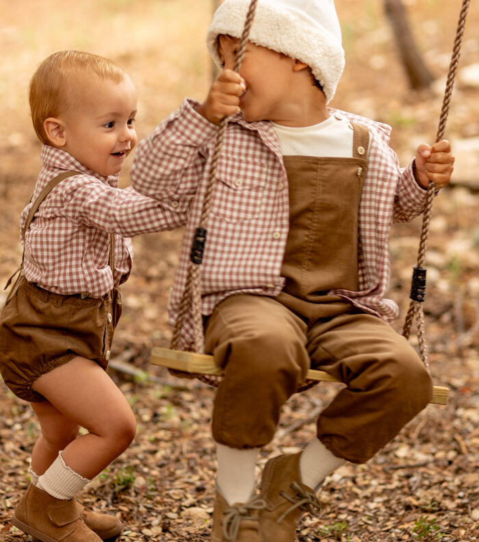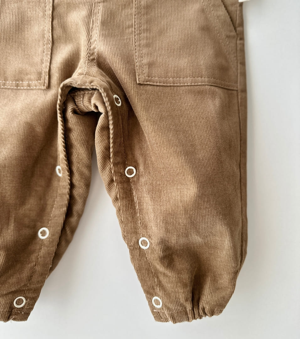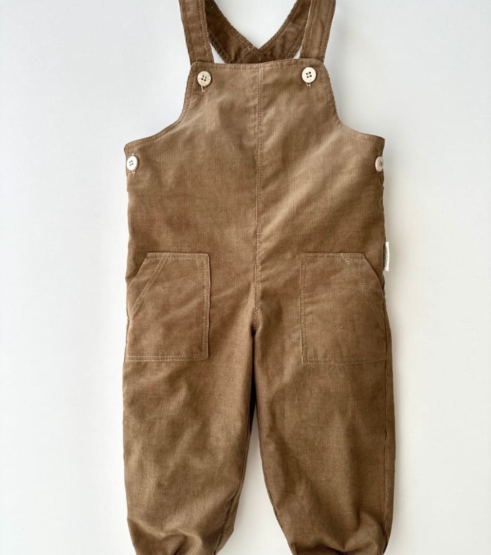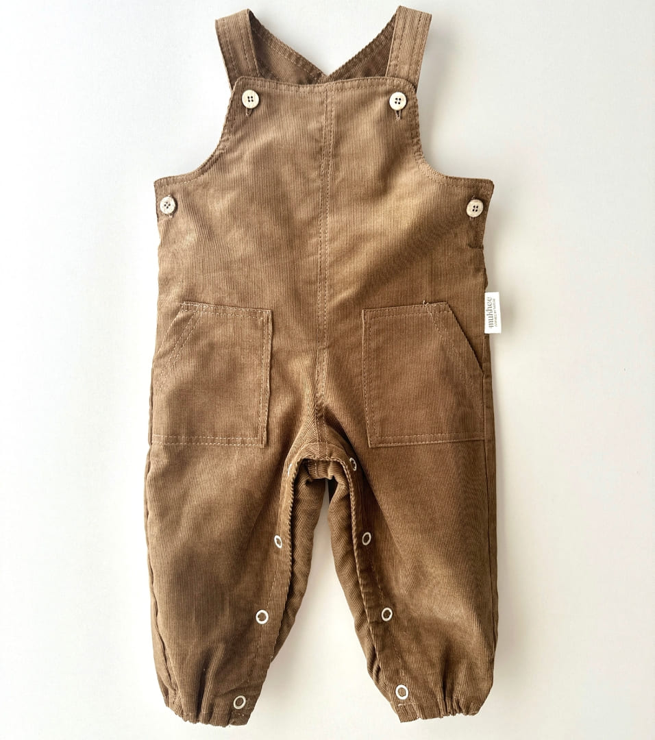 Peto en pana fina de algodón orgánico 100% en color marrón chocolate con leche. Es un modelo muy versátil y fácil de combinar, pensado tanto para niño como para niña.