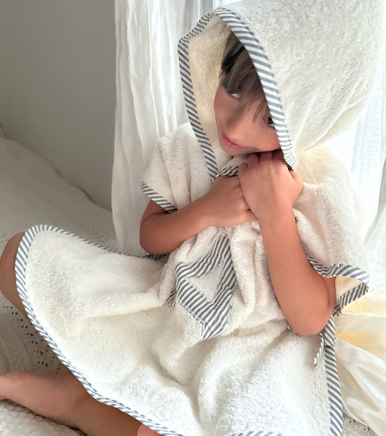 El tejido de toalla es natural, no está blanqueado, y como resultado podrías ver alguna semilla de la planta de algodón en la tela. Es un tejido gordito de 450gr., súper suave, mullidito y muy agradable al contacto con la piel del niño. Seca muy bien. Con certificado GOTS y OEKO-TEX Standard 100 (puedes conocer más sobre estas certificaciones aquí).
