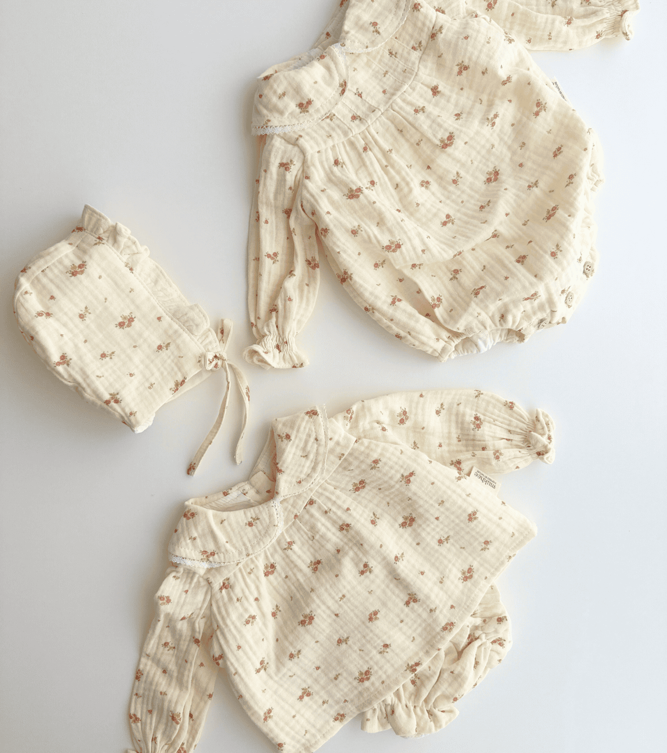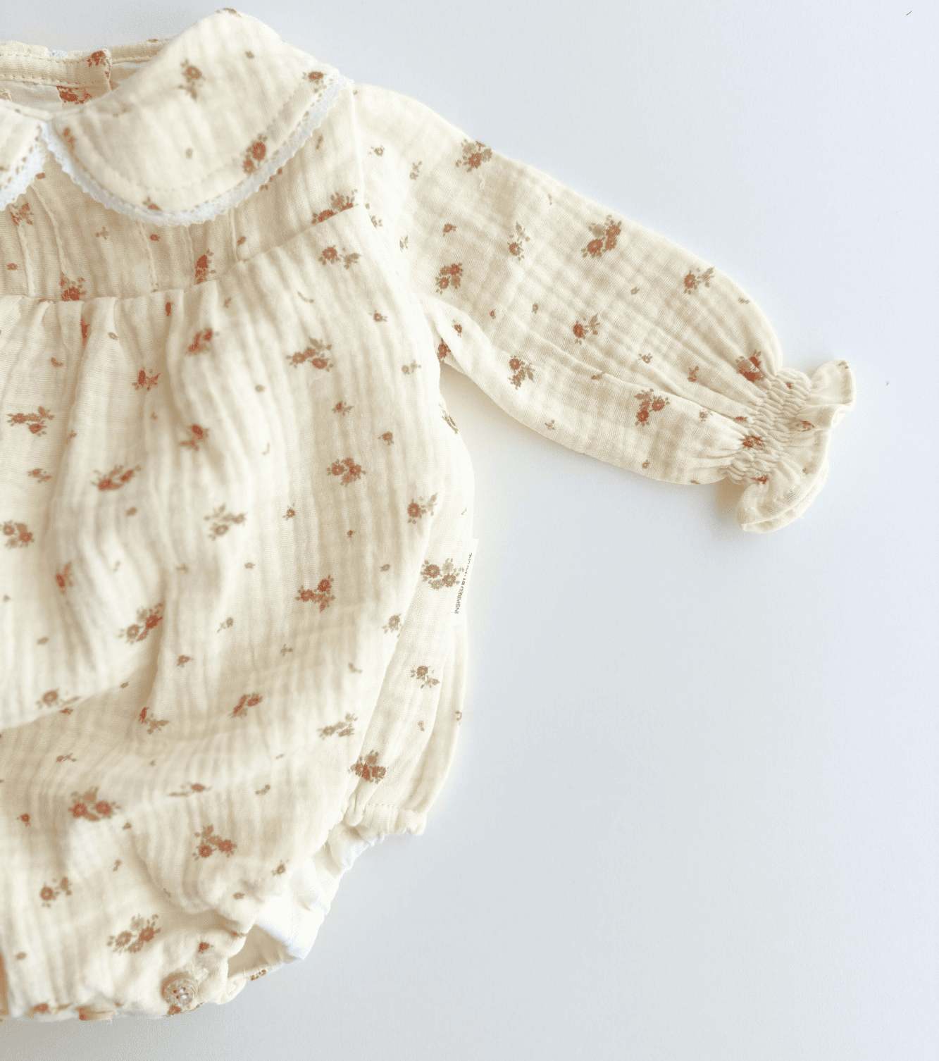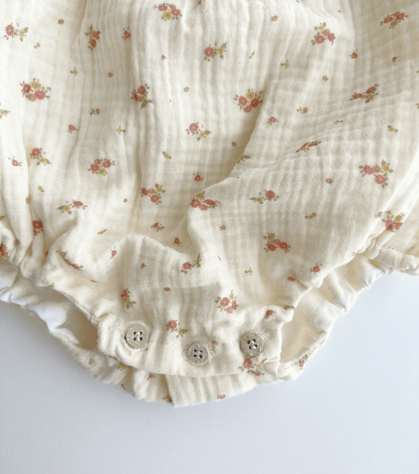 Ranita en muselina doble de algodón orgánico 100% con estampado de flores en color rosa palo sobre fondo crudo. Un estampado muy dulce.