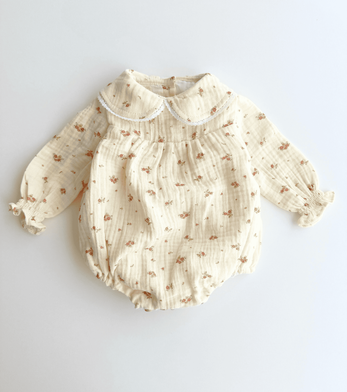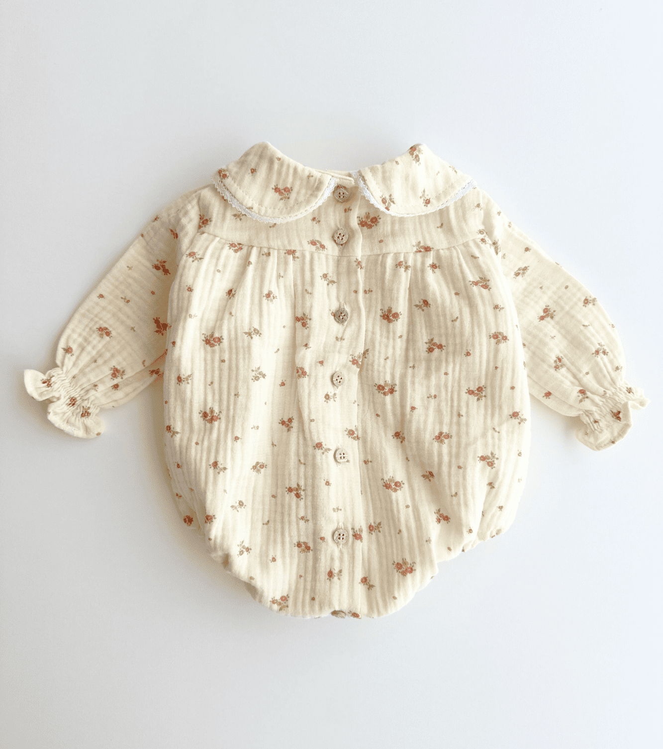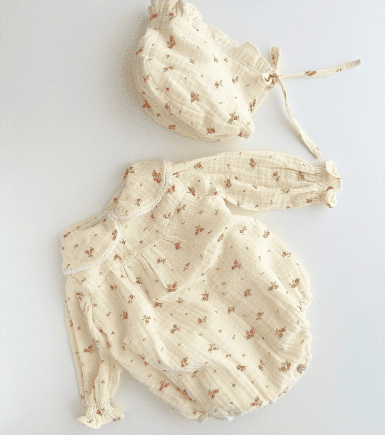 Ranita en muselina doble de algodón orgánico 100% con estampado de flores en color rosa palo sobre fondo crudo. Un estampado muy dulce.