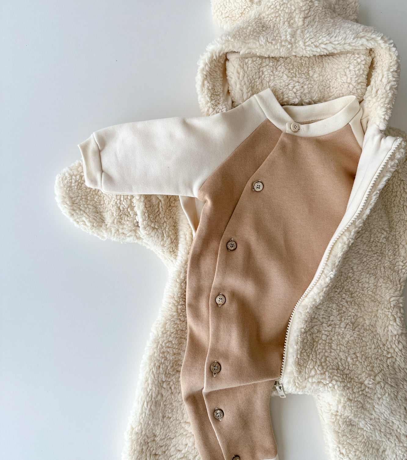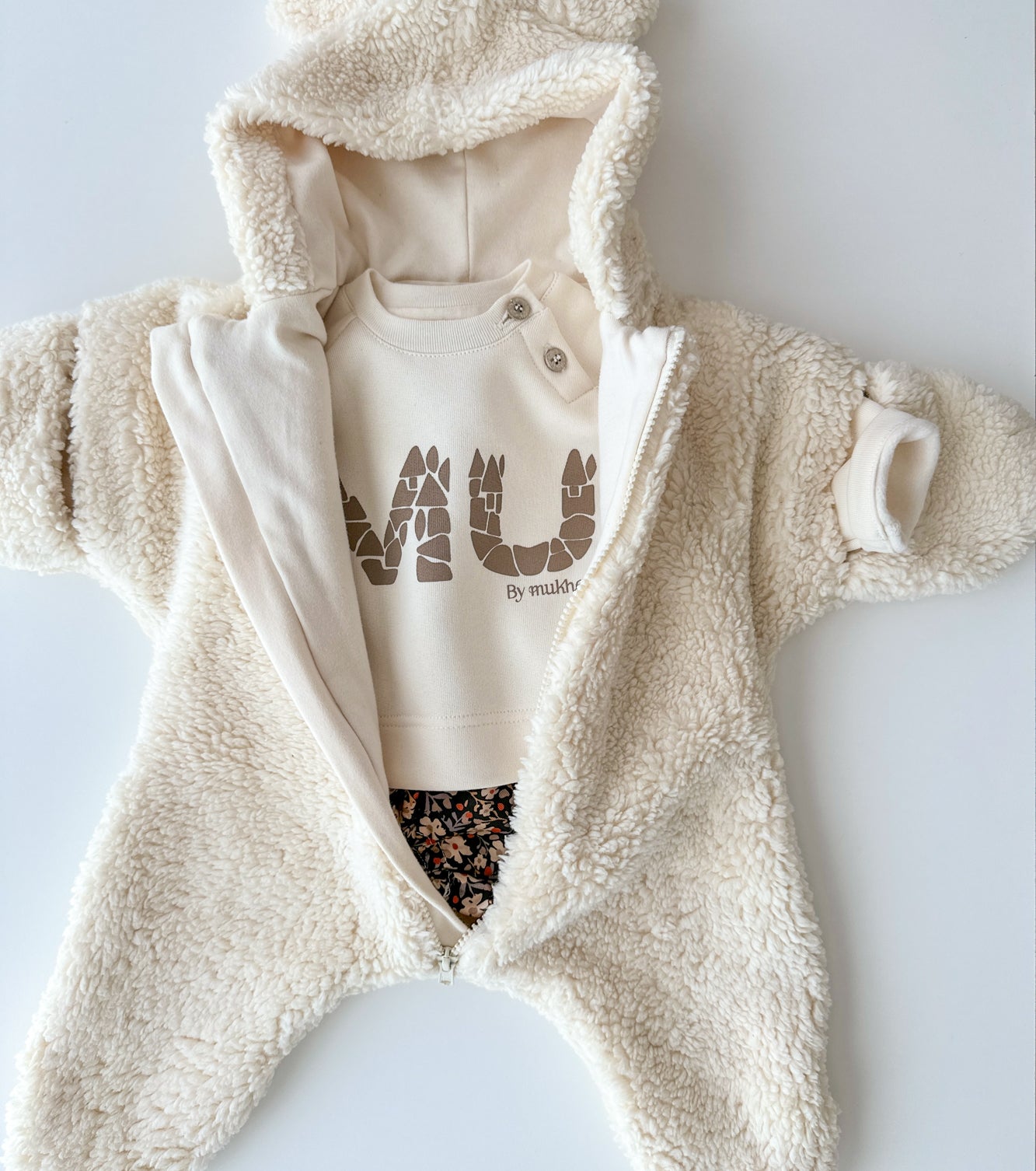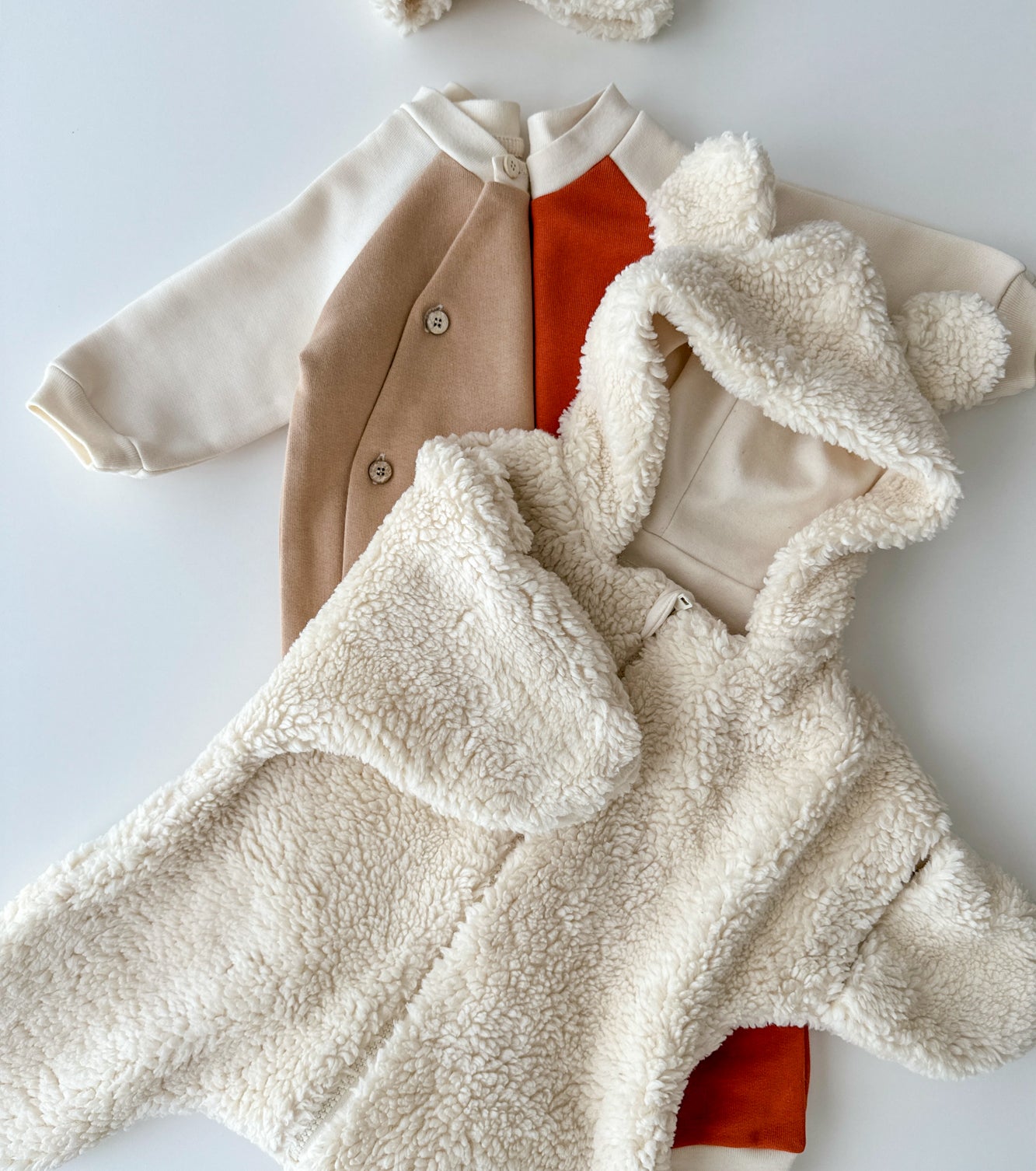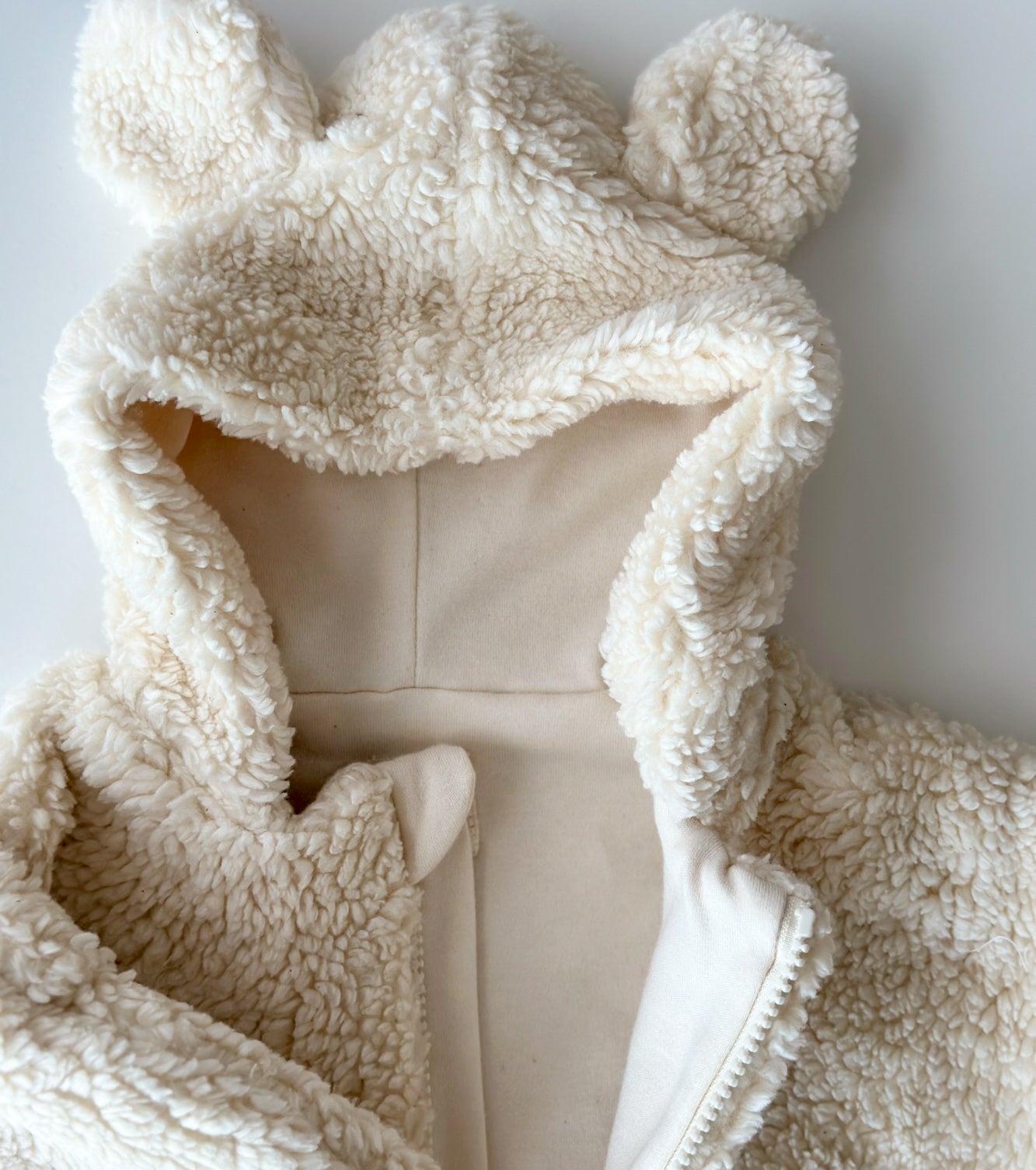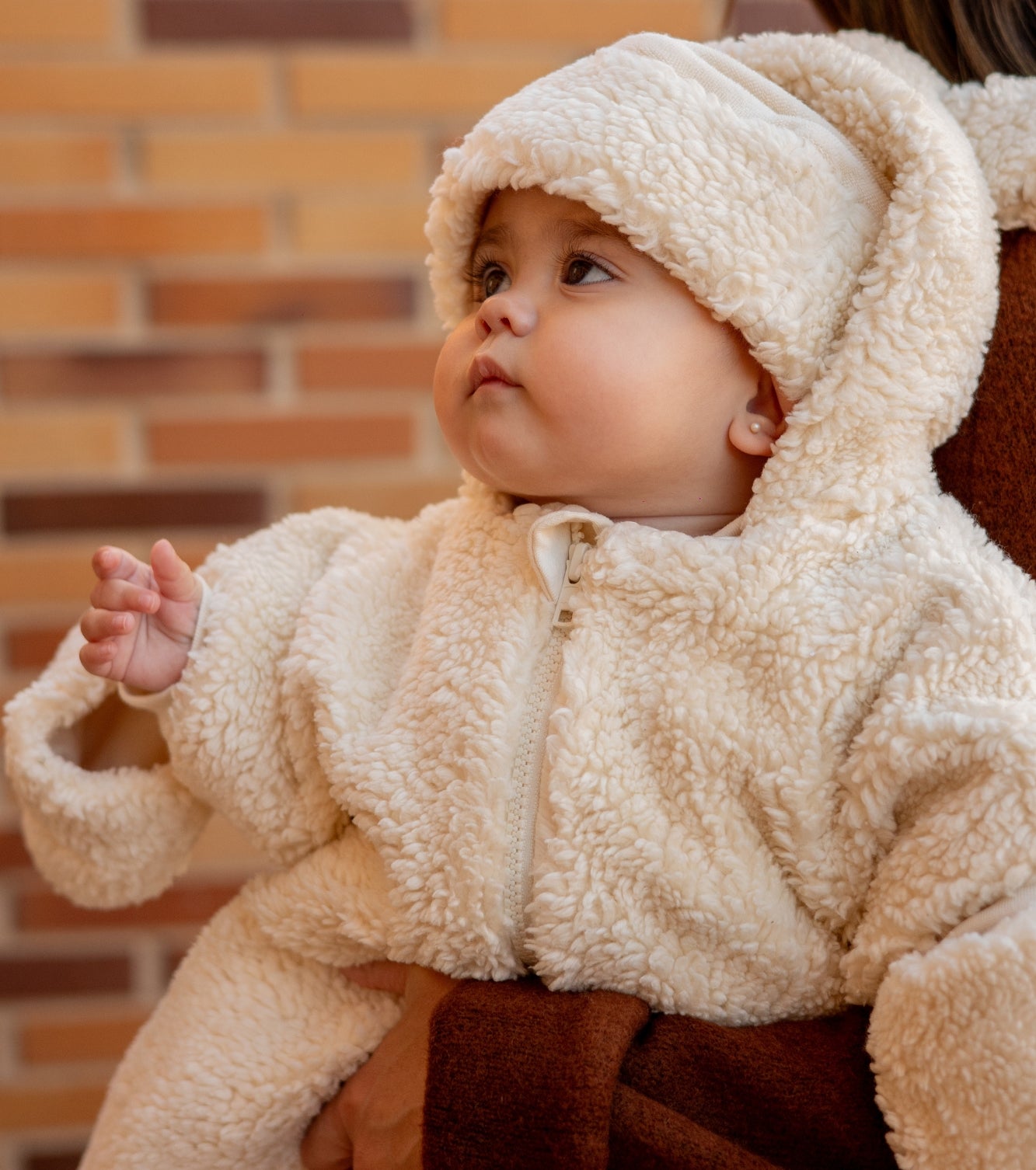 Composición | Tejido principal en borreguito 100% algodón orgánico, suave y esponjoso. Forro en punto de interlock 100% algodón orgánico. Sin elastano. Cremallera metálica y 100% algodón orgánico. |