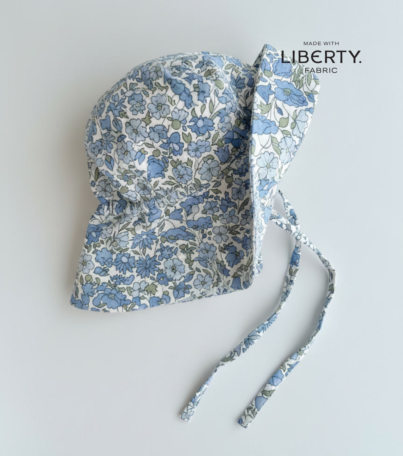Sombrero con ala en voile de algodón 100% en estampado Liberty de la colección Nomeolvides en flores azules con detalles en verde. Un estampado muy delicado y romántico.