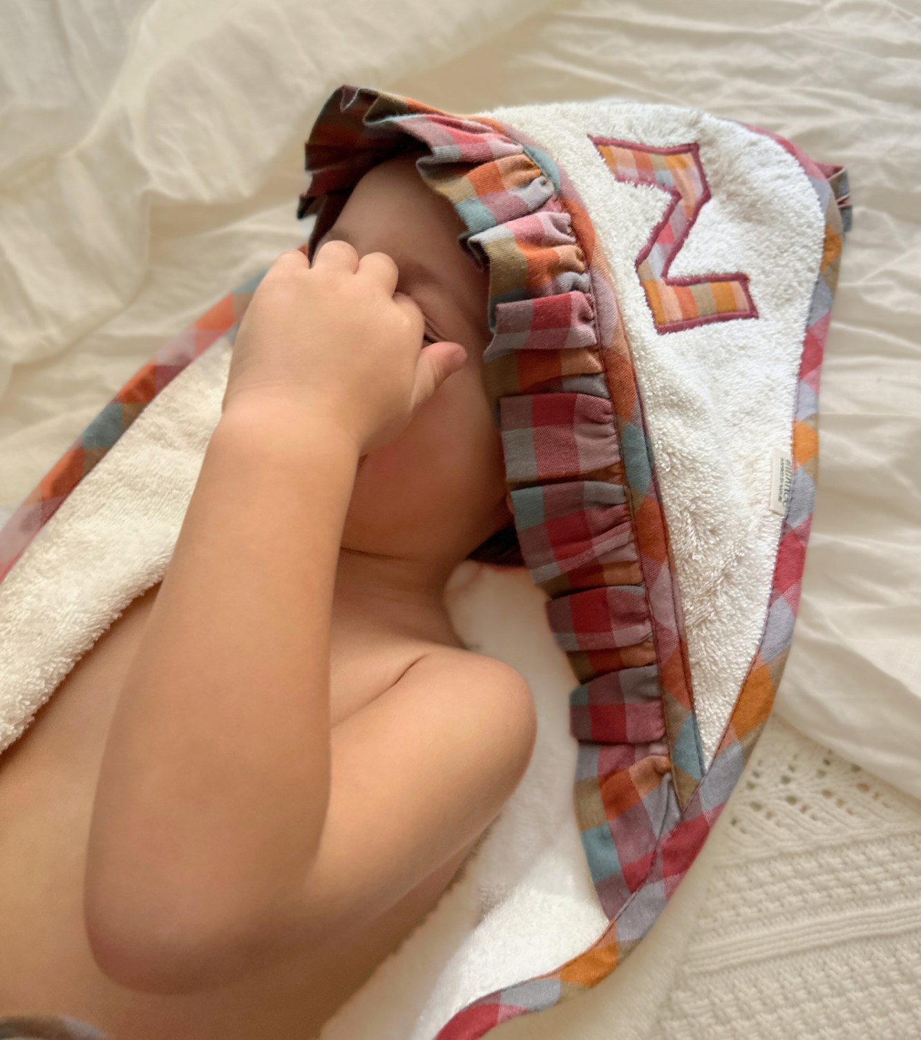 Toalla capa en tejido de algodón orgánico muy absorbente. Toalla en color natural, sin blanquear. El volante y su estampado de cuadros en tonos otoñales le dan un toque divertido y cálido a la vez.